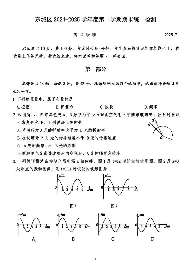 高二物理答案--北京市东城区2024-2025学年高二下学期期末考试