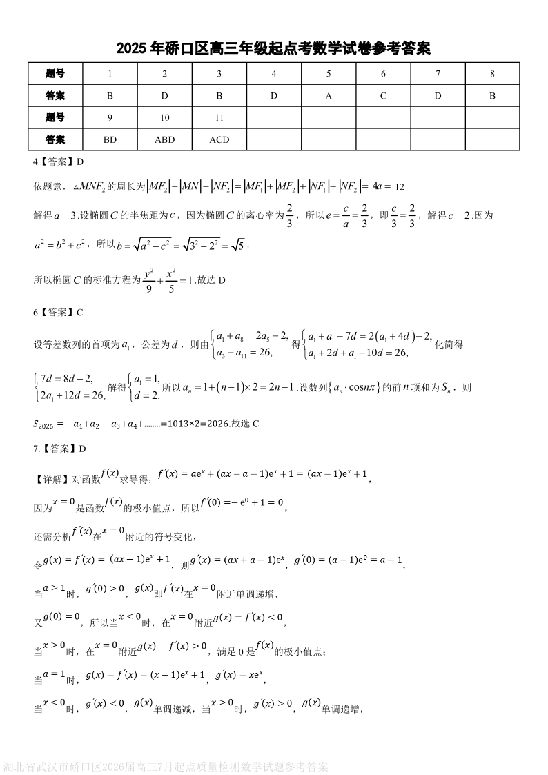 高三数学答案--湖北省武汉市硚口区2025-2026学年高三上学期7月起点质量检测