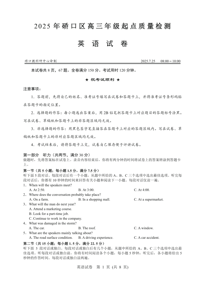 高三英语--湖北省武汉市硚口区2025-2026学年高三上学期7月起点质量检测
