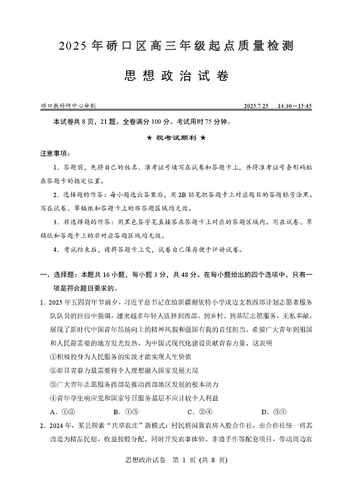 高三政治--湖北省武汉市硚口区2025-2026学年高三上学期7月起点质量检测