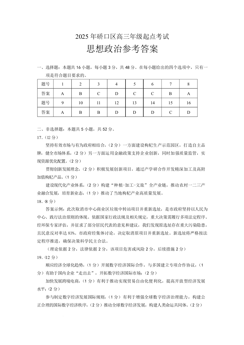 高三政治答案--湖北省武汉市硚口区2025-2026学年高三上学期7月起点质量检测