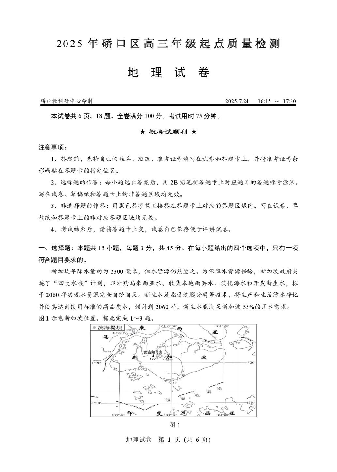 高三地理--湖北省武汉市硚口区2025-2026学年高三上学期7月起点质量检测