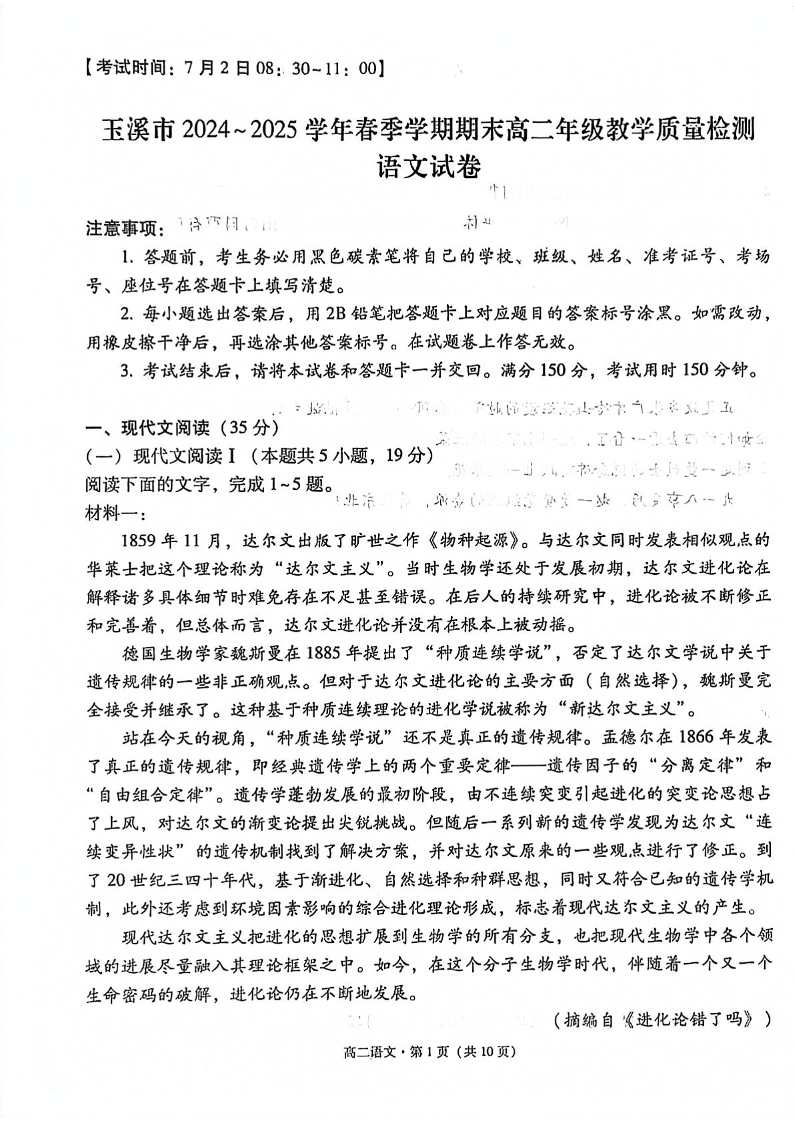 高二语文+答案--云南省玉溪市2024-2025学年高二下学期期末教学质量检测