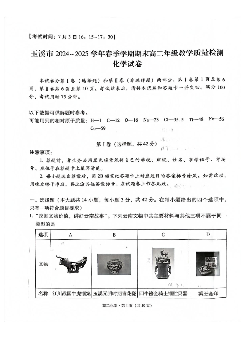 高二化学+答案--云南省玉溪市2024-2025学年高二下学期期末教学质量检测