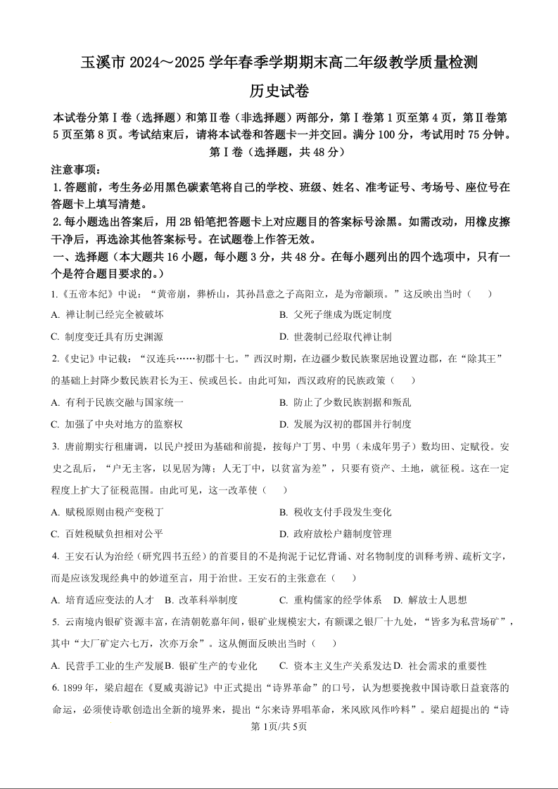 高二历史原卷版--云南省玉溪市2024-2025学年高二下学期期末教学质量检测