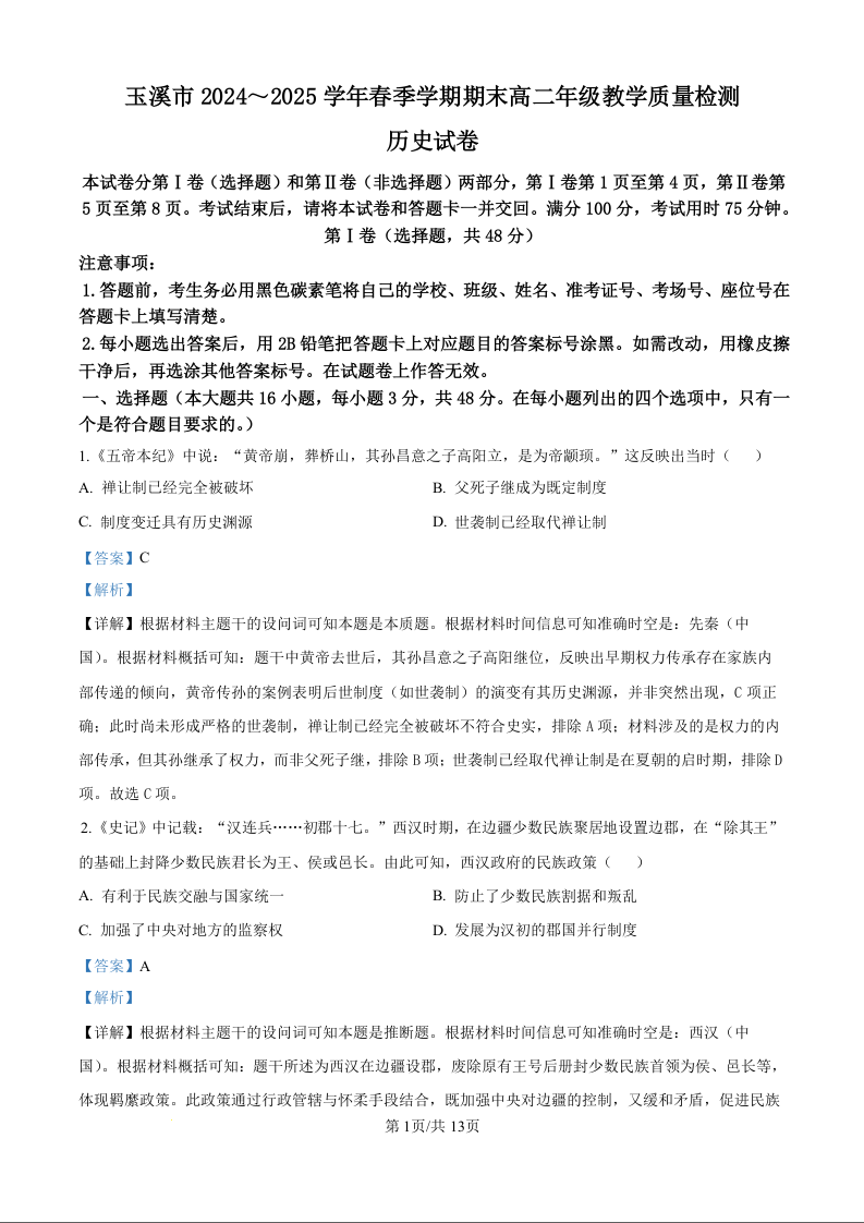 高二历史解析版--云南省玉溪市2024-2025学年高二下学期期末教学质量检测
