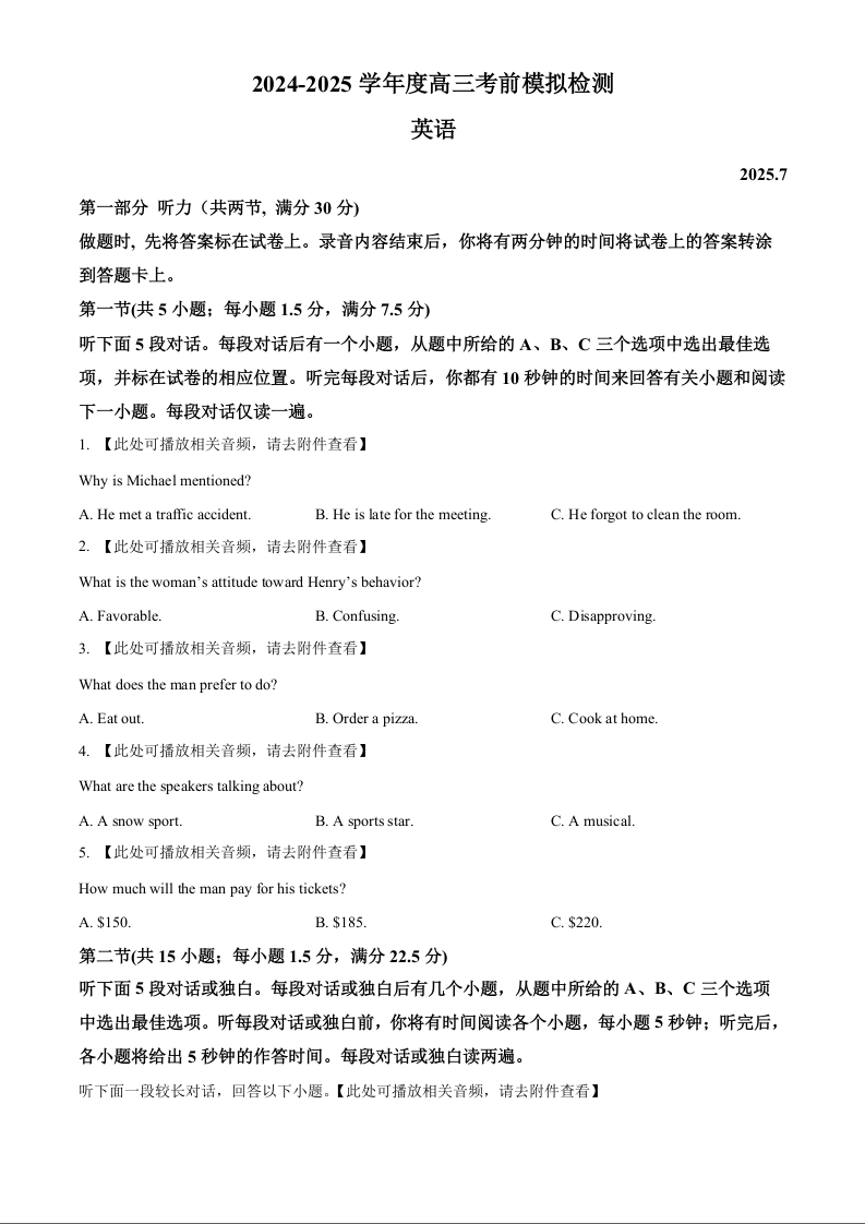 高三英语--江苏省南京市第二十九中学2026届高三上学期模拟预测试题
