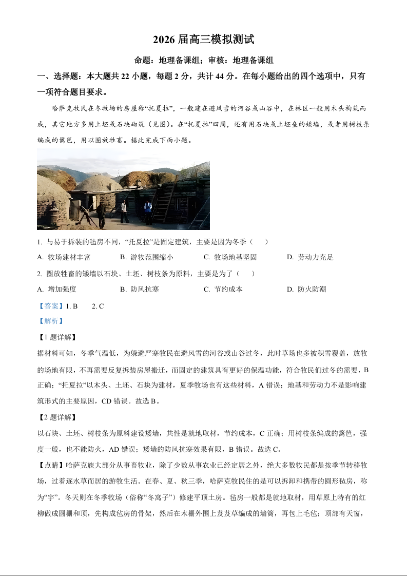 高三地理解析版--江苏省南京市第二十九中学2026届高三上学期模拟预测试题