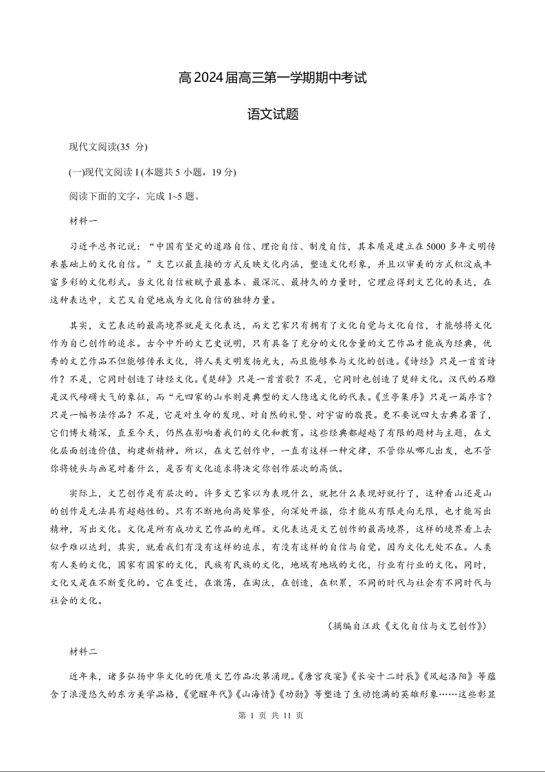重庆主城九龙坡区高2024届高三第一学期期中考试语文
