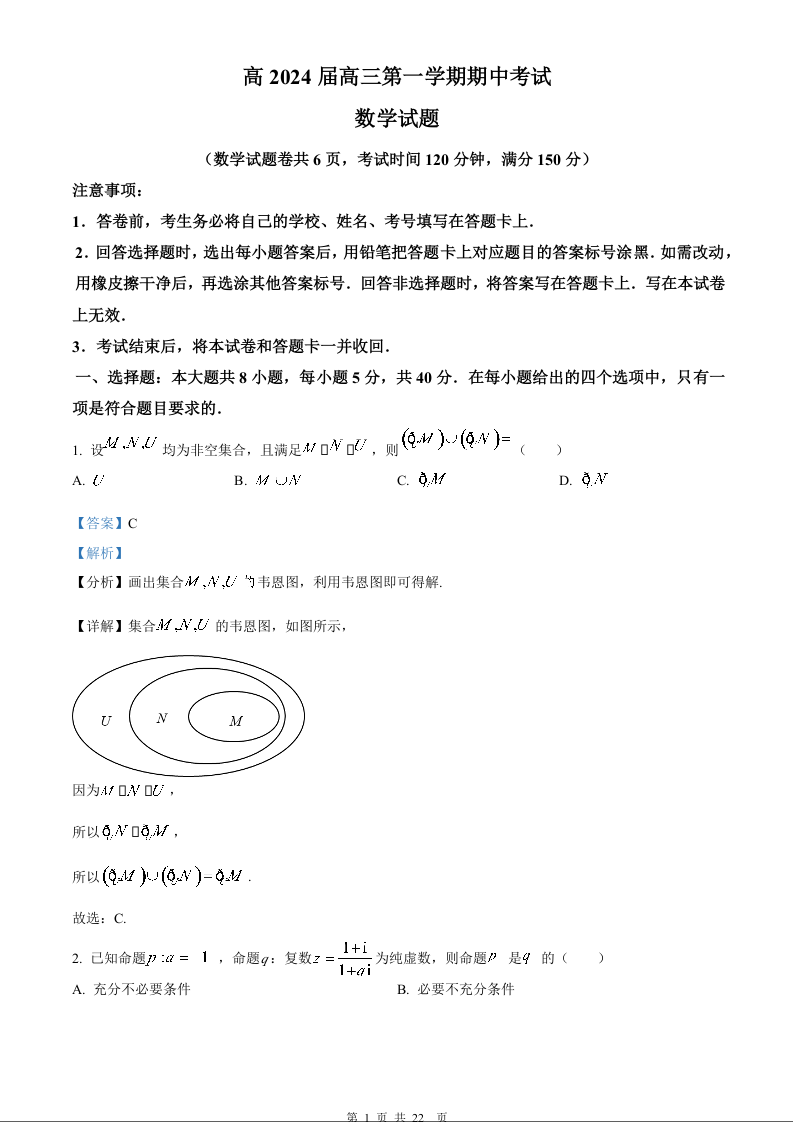 重庆主城九龙坡区高2024届高三第一学期期中考试数学答案