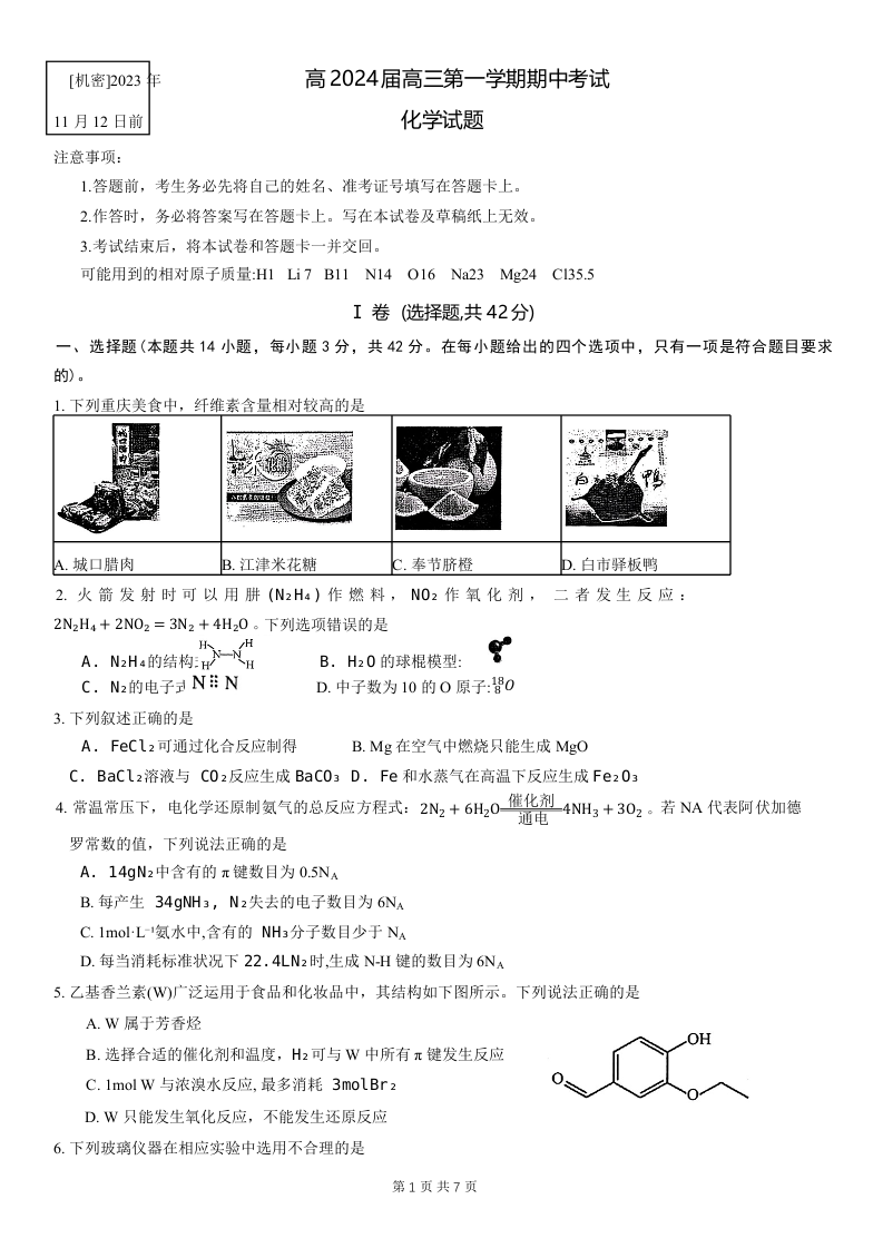 重庆主城九龙坡区高2024届高三第一学期期中考试化学