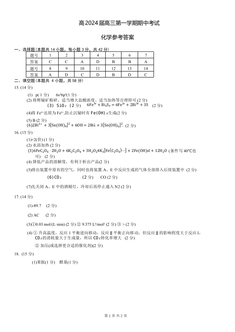 重庆主城九龙坡区高2024届高三第一学期期中考试化学答案