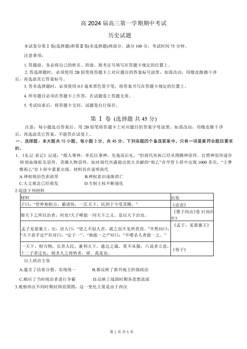 重庆主城区半期高2024届高三第一学期期中考试历史试题
