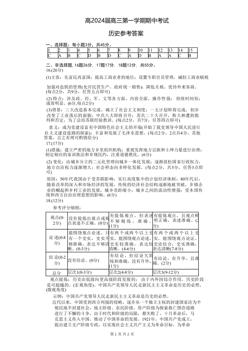重庆主城九龙坡区高2024届高三第一学期期中考试历史答案