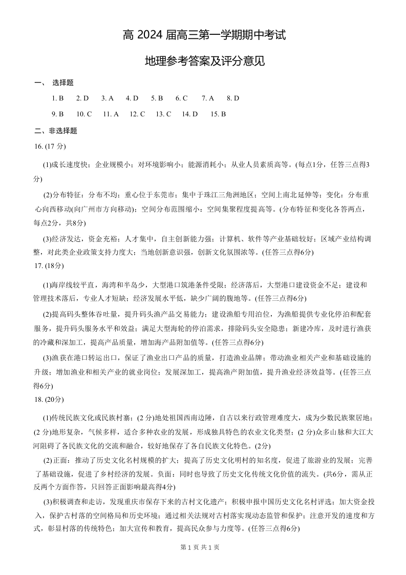 重庆主城九龙坡区高2024届高三第一学期期中考试地理答案