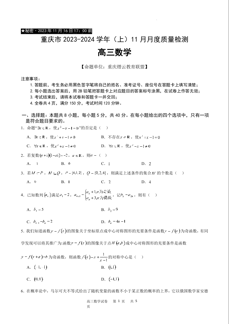 重庆市缙云教育联盟2023-2024学年高三上学期11月月考数学