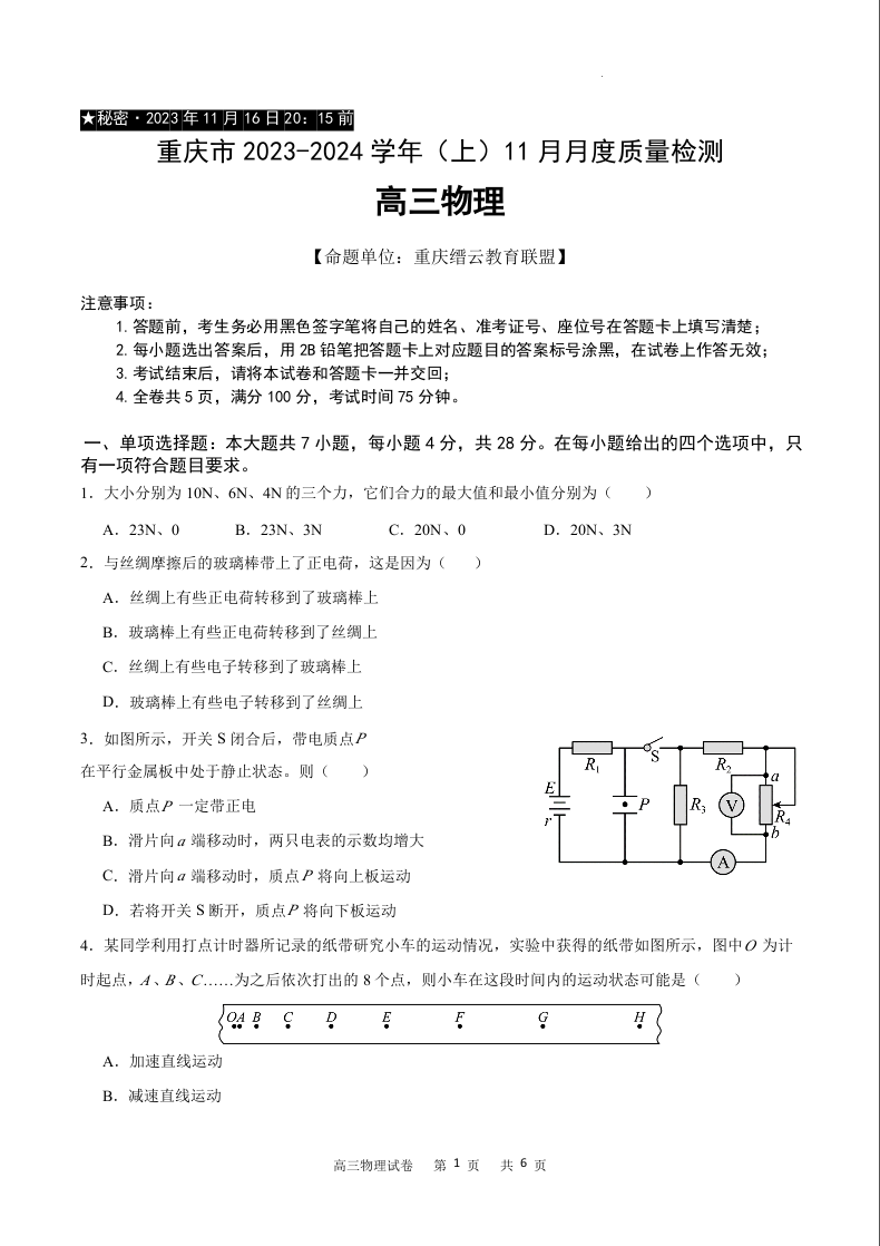 重庆市缙云教育联盟2023-2024学年高三上学期11月月考物理