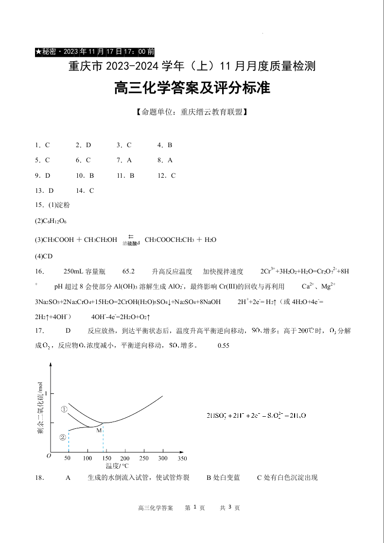 重庆市缙云教育联盟2023-2024学年高三上学期11月月考化学答案