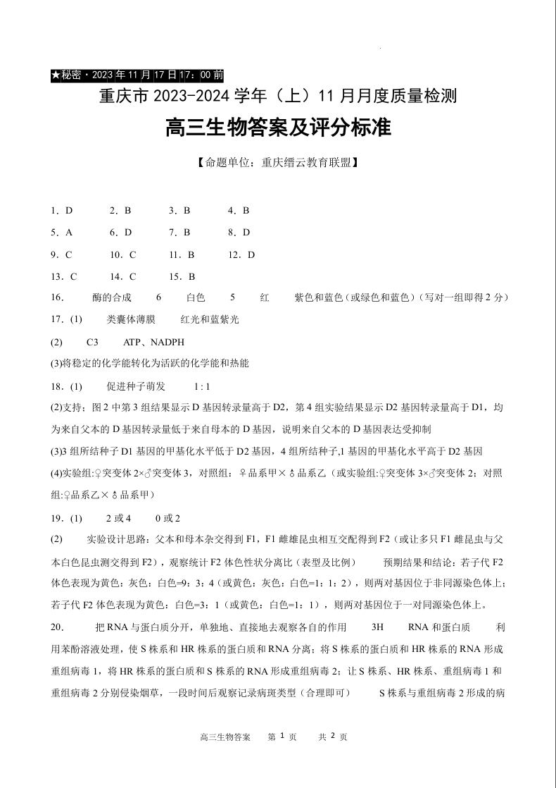 重庆市缙云教育联盟2023-2024学年高三上学期11月月考生物答案