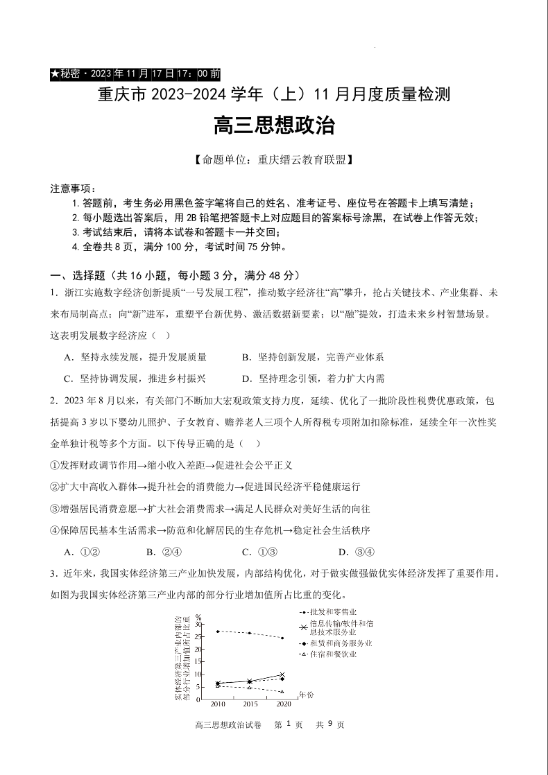 重庆市缙云教育联盟2023-2024学年高三上学期11月月考政治