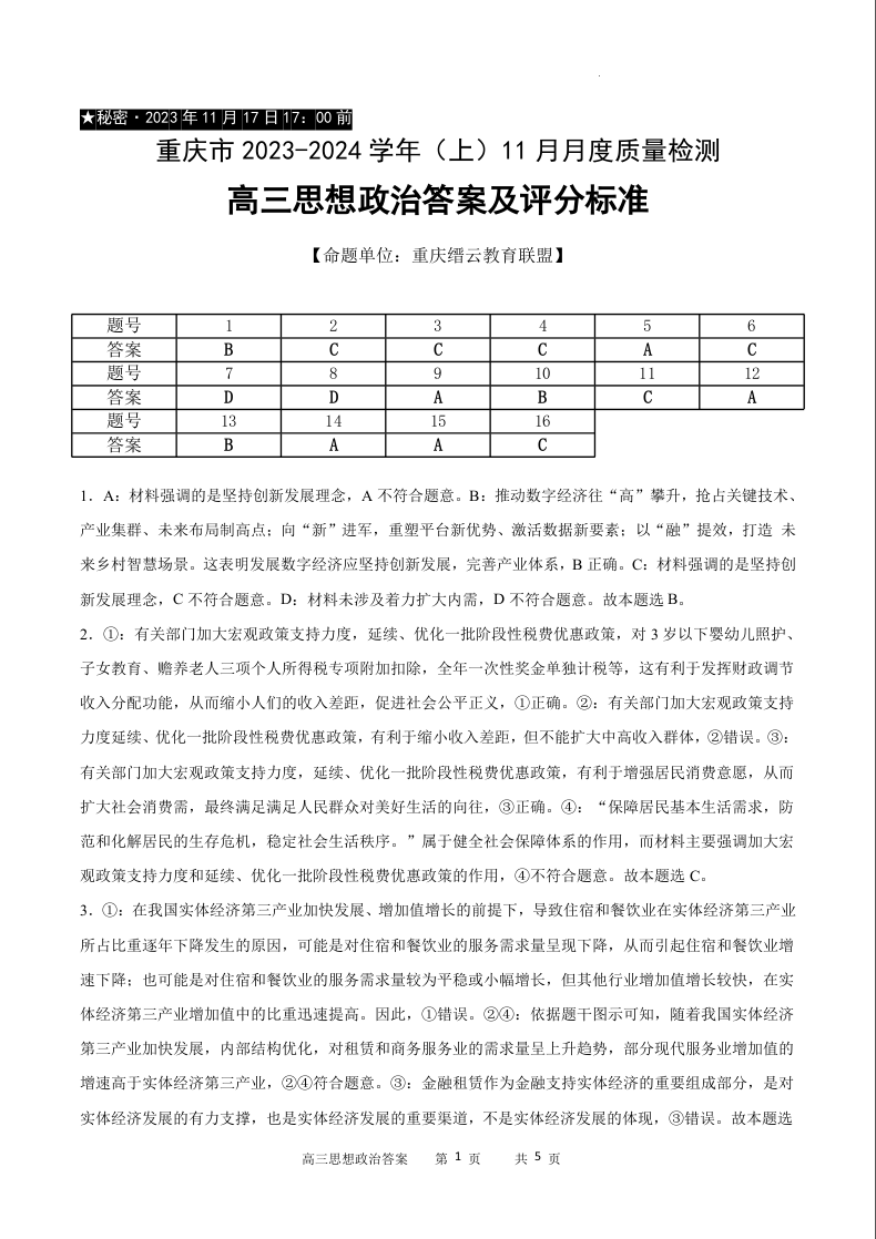 重庆市缙云教育联盟2023-2024学年高三上学期11月月考政治答案