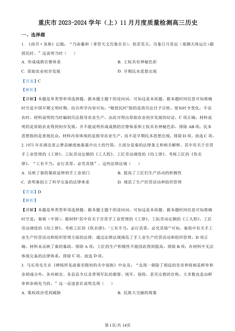 重庆市缙云教育联盟2023-2024学年高三上学期11月月考历史(精品解析版)
