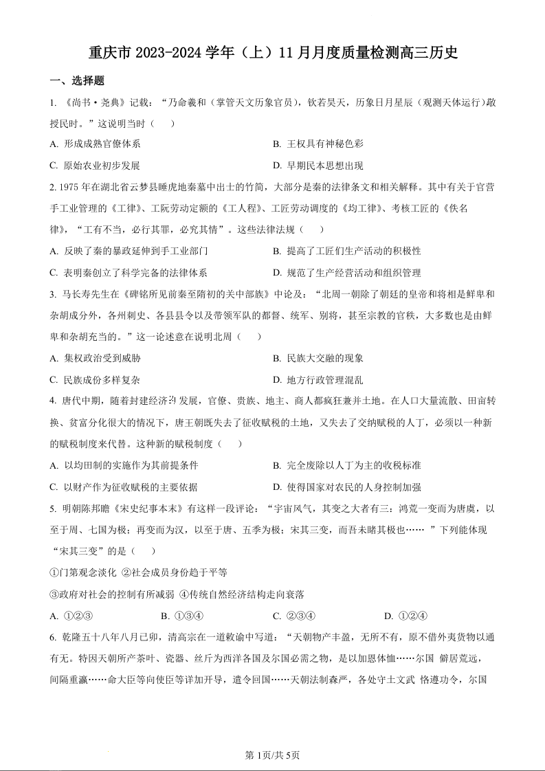 重庆市缙云教育联盟2023-2024学年高三上学期11月月考历史(原卷版)