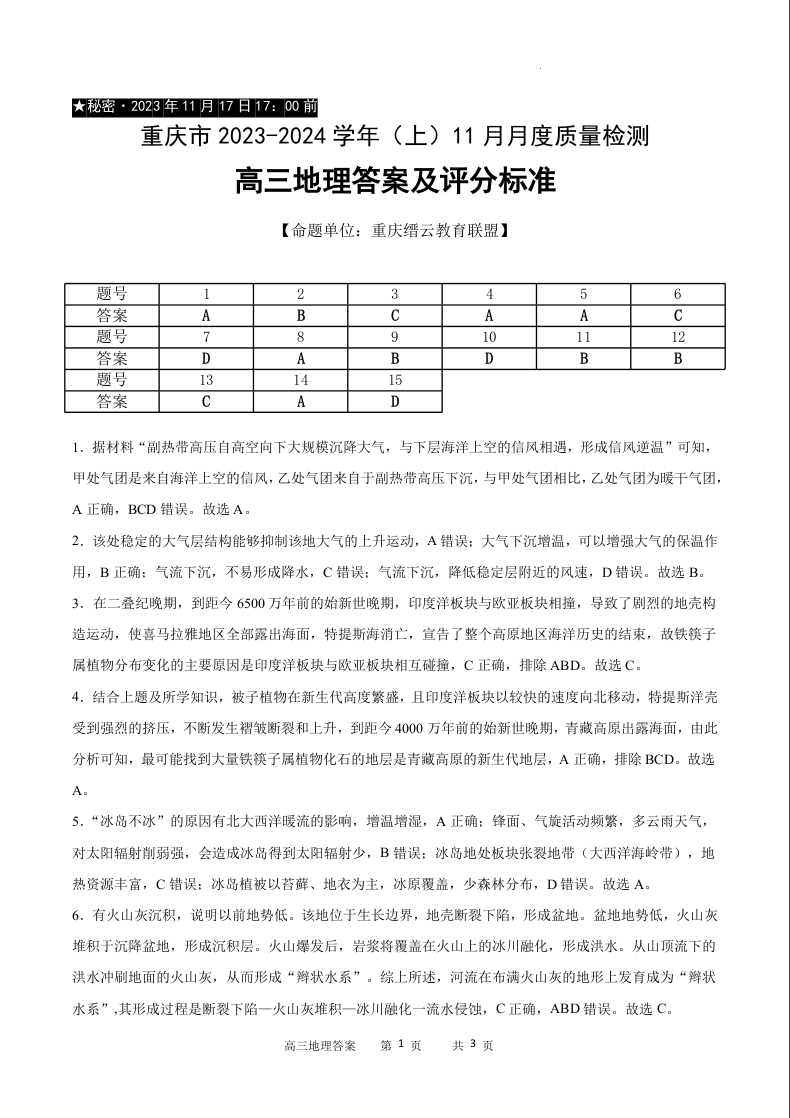 重庆市缙云教育联盟2023-2024学年高三上学期11月月考地理答案