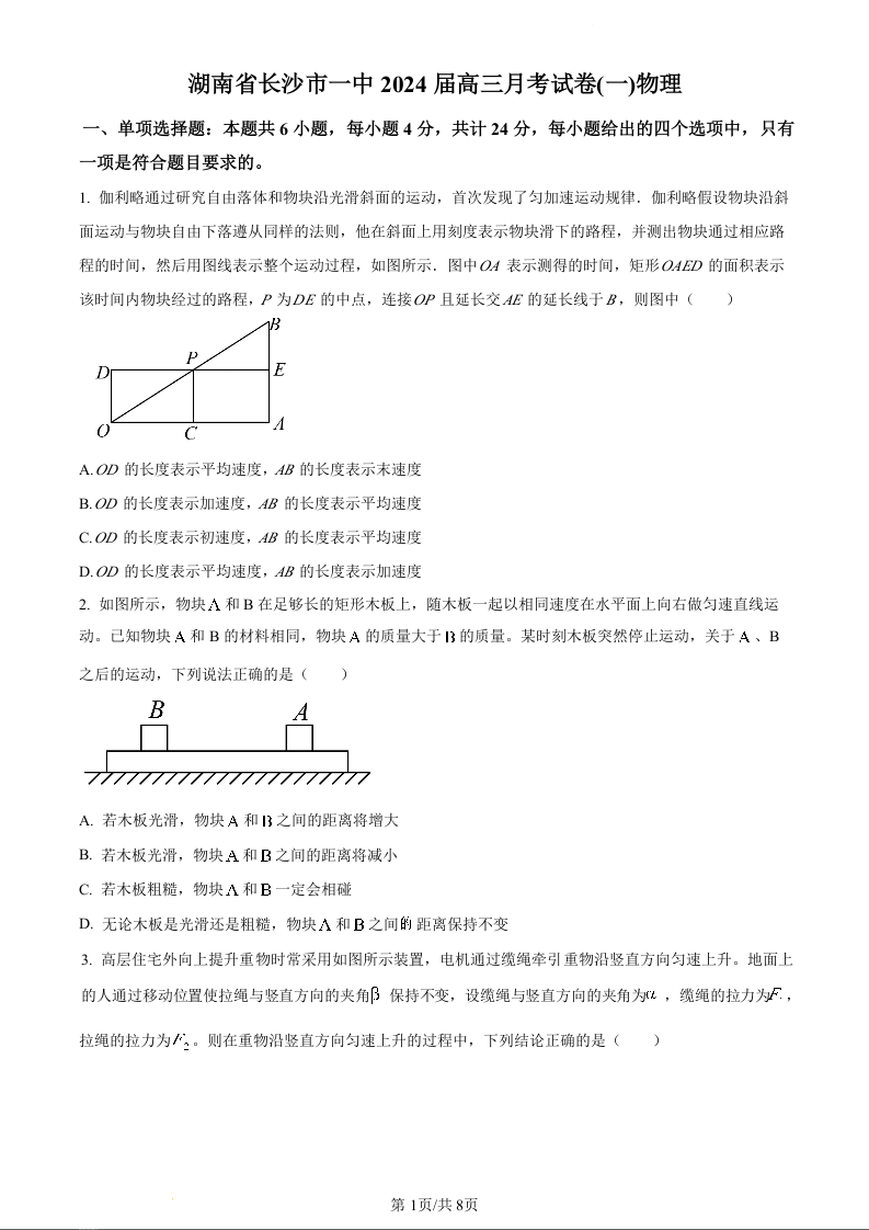 湖南省长沙市第一中学2024届高三上学期月考(一)物理(原卷版)