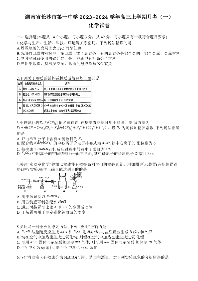 湖南省长沙市第一中学2024届高三上学期月考(一) 化学