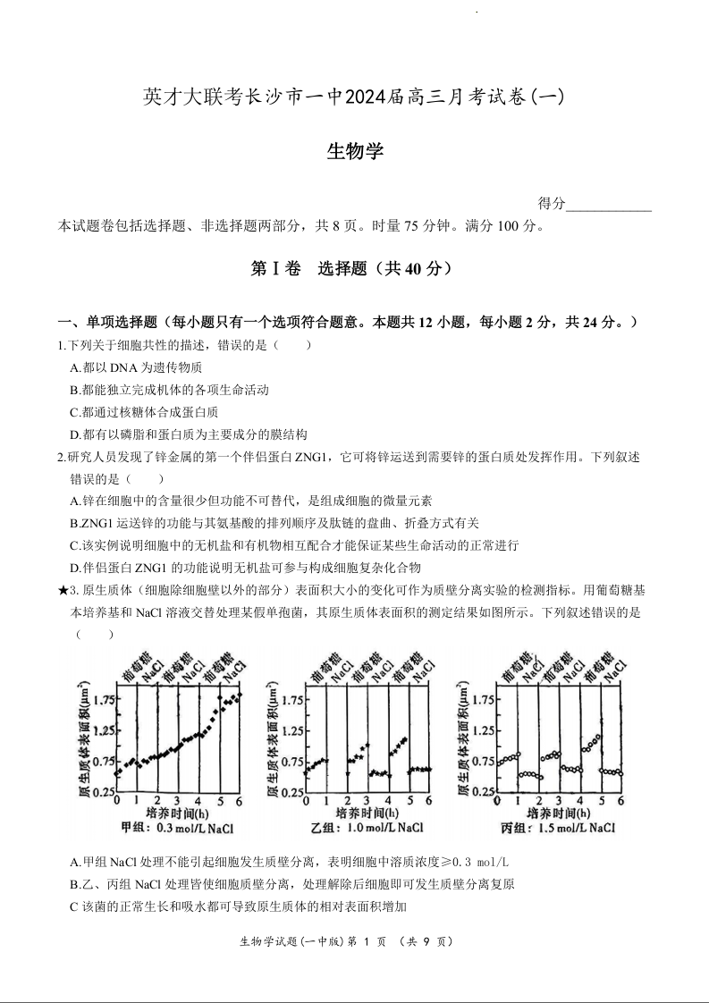 湖南省长沙市第一中学2024届高三上学期月考(一)生物