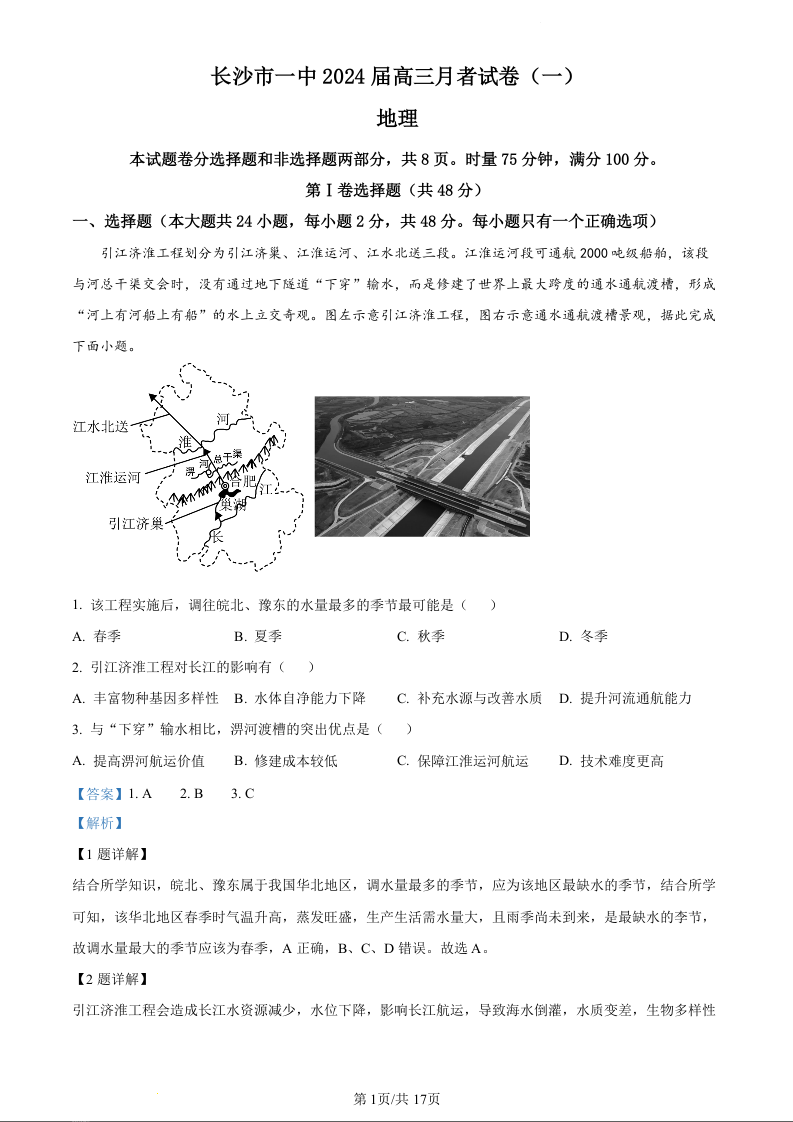 湖南省长沙市第一中学2024届高三上学期月考(一)地理(精品解析版)