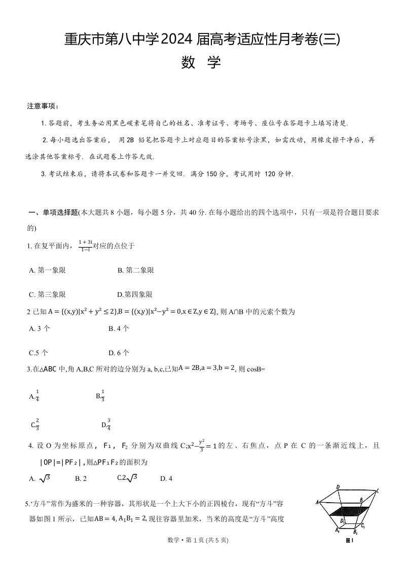 重庆市第八中学2024届高考适应性月考卷(三)数学