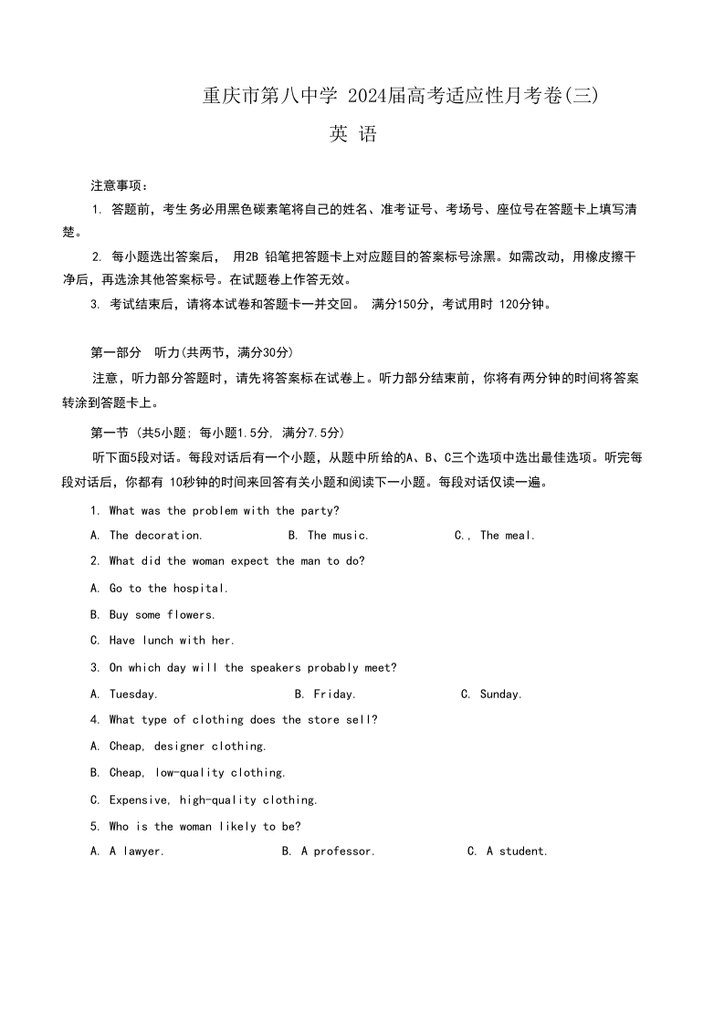重庆市第八中学2024届高考适应性月考卷(三)英语