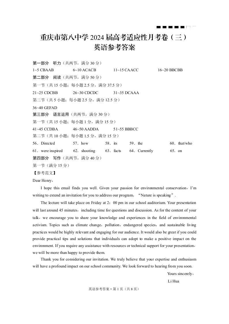 重庆市第八中学2024届高考适应性月考卷(三)英语答案