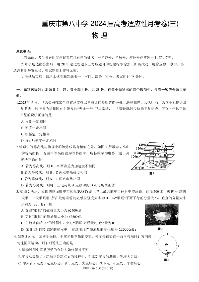 重庆市第八中学2024届高考适应性月考卷(三)物理