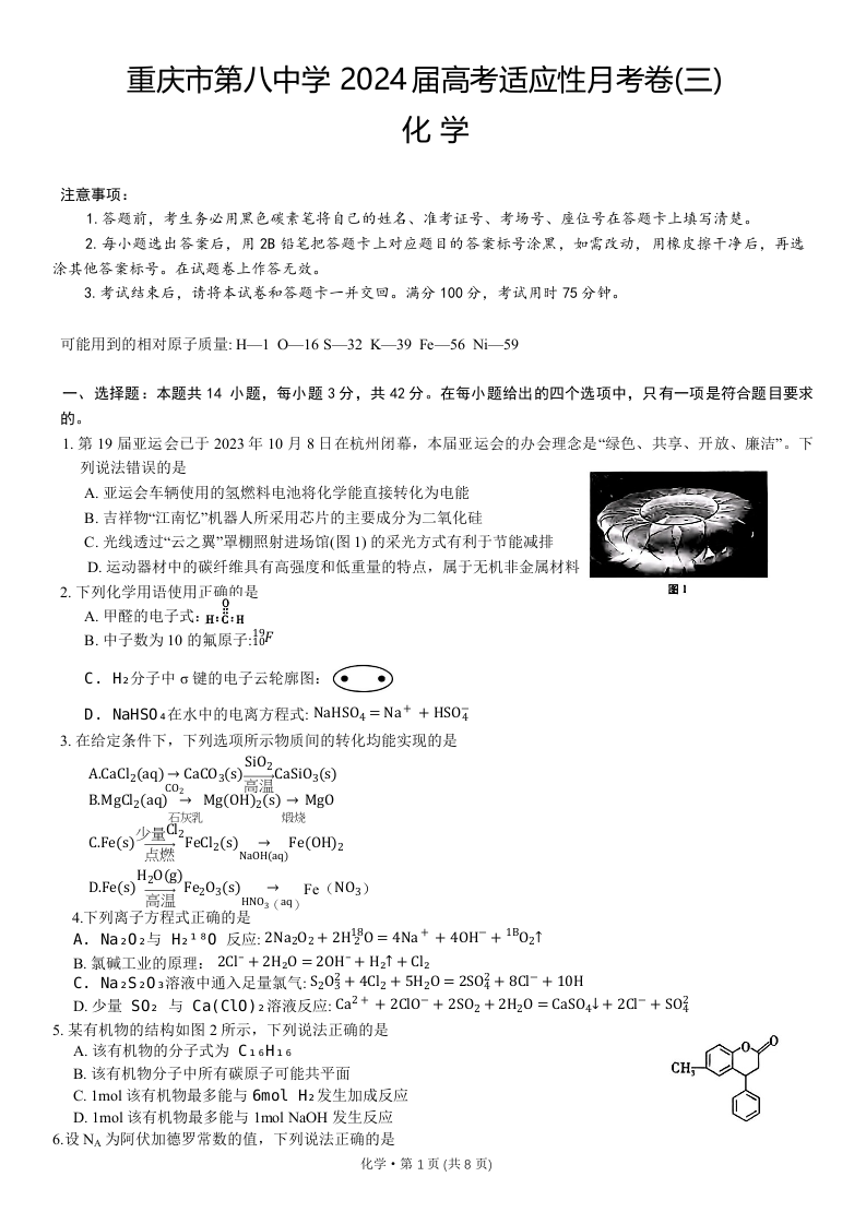 重庆市第八中学2024届高考适应性月考卷(三)化学