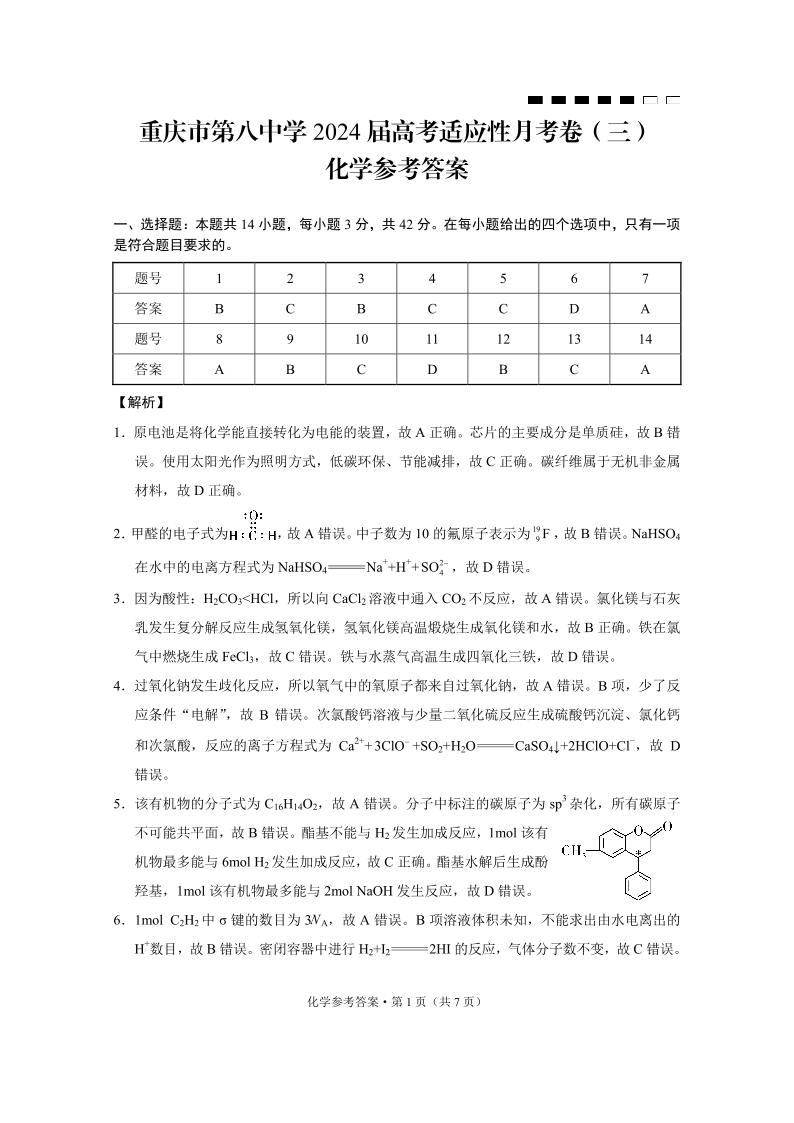 重庆市第八中学2024届高考适应性月考卷(三)化学答案