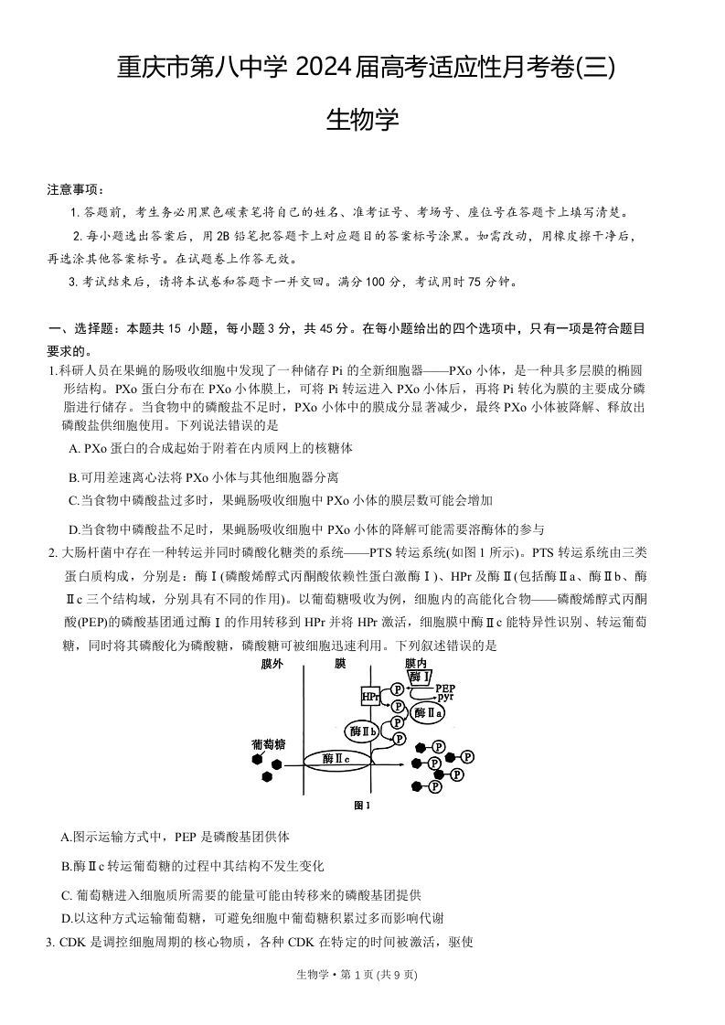 重庆市第八中学2024届高考适应性月考卷(三)生物