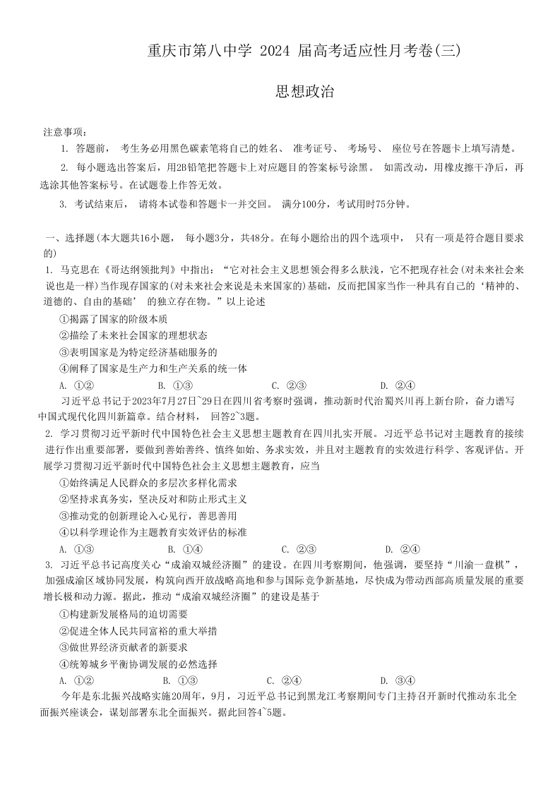 重庆市第八中学2024届高考适应性月考卷(三)政治