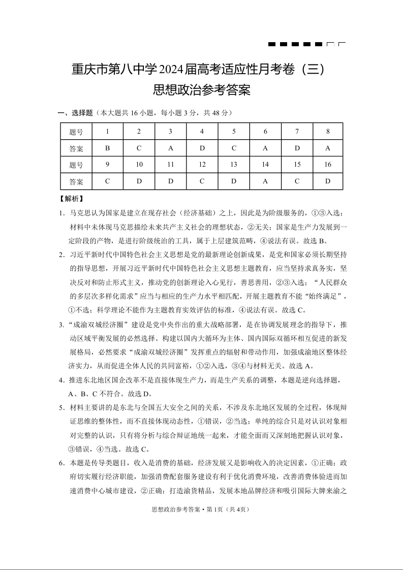 重庆市第八中学2024届高考适应性月考卷(三)政治答案