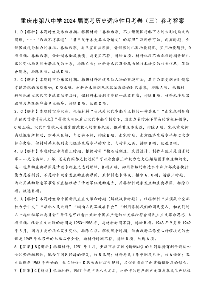 重庆市第八中学2024届高考适应性月考卷(三)历史答案