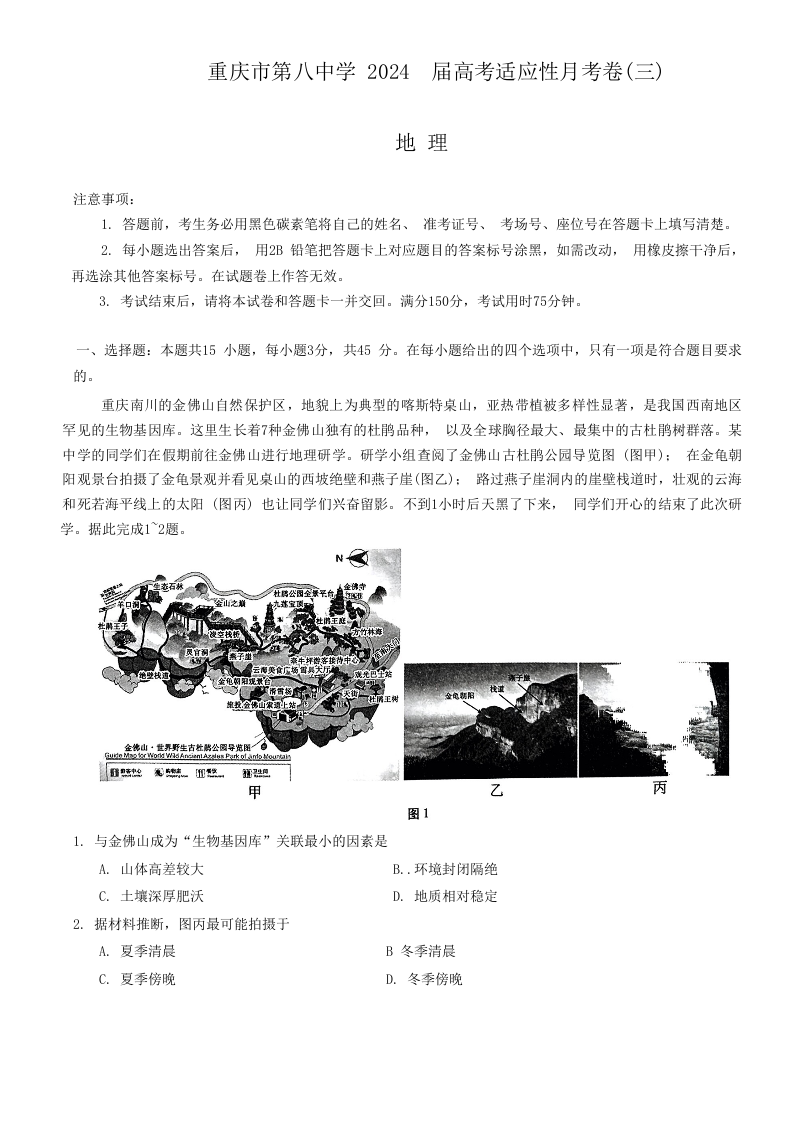 重庆市第八中学2024届高考适应性月考卷(三)地理