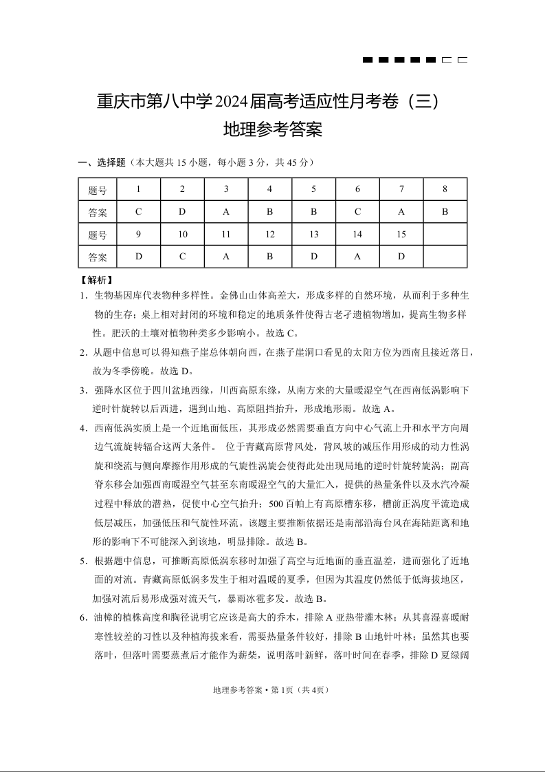 重庆市第八中学2024届高考适应性月考卷(三)地理答案