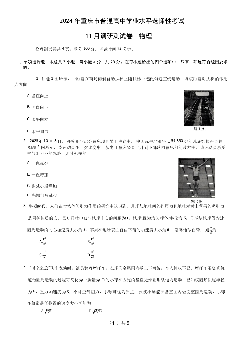 重庆康德半期统考2024年普通高等学校招生全国统一考试高三11月调研卷物理