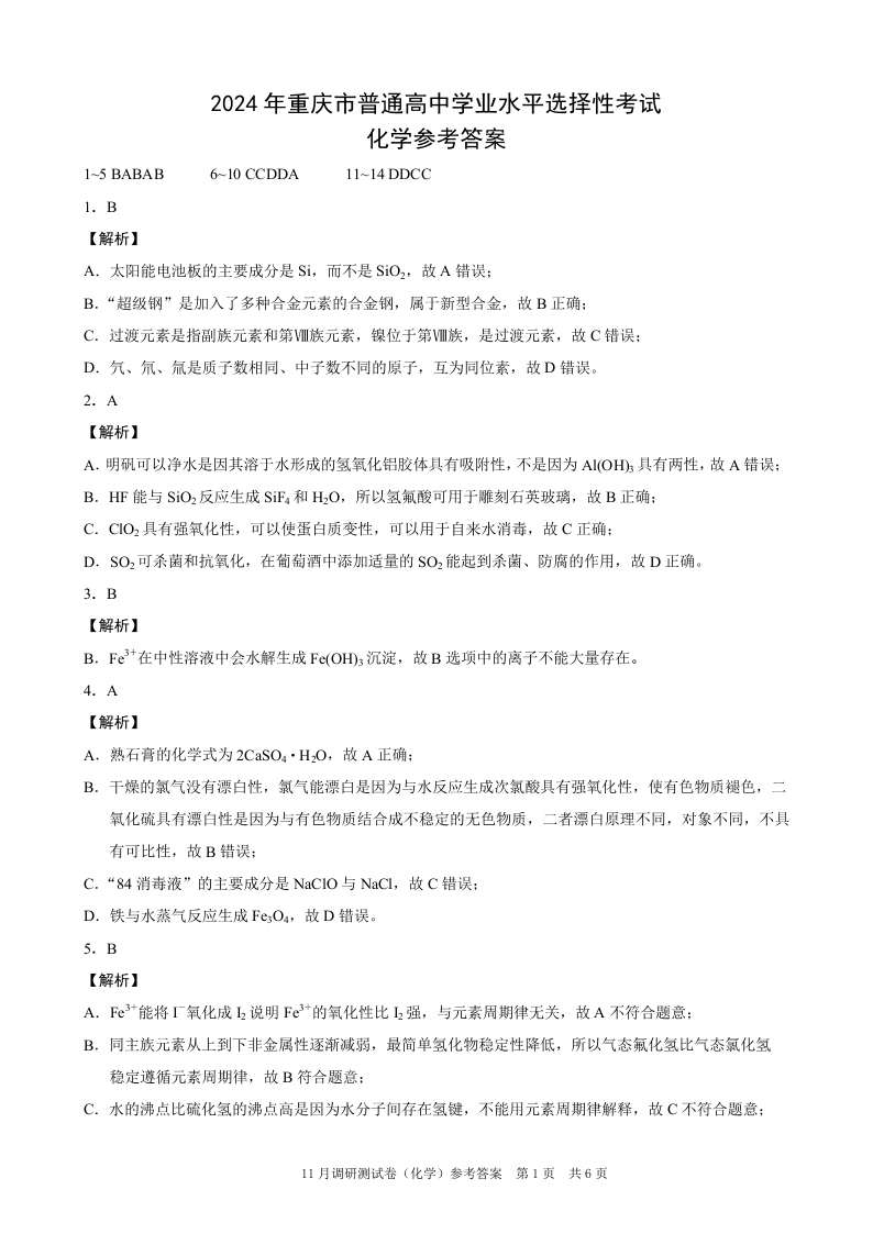 重庆康德半期统考2024年普通高等学校招生全国统一考试高三11月调研卷化学答案