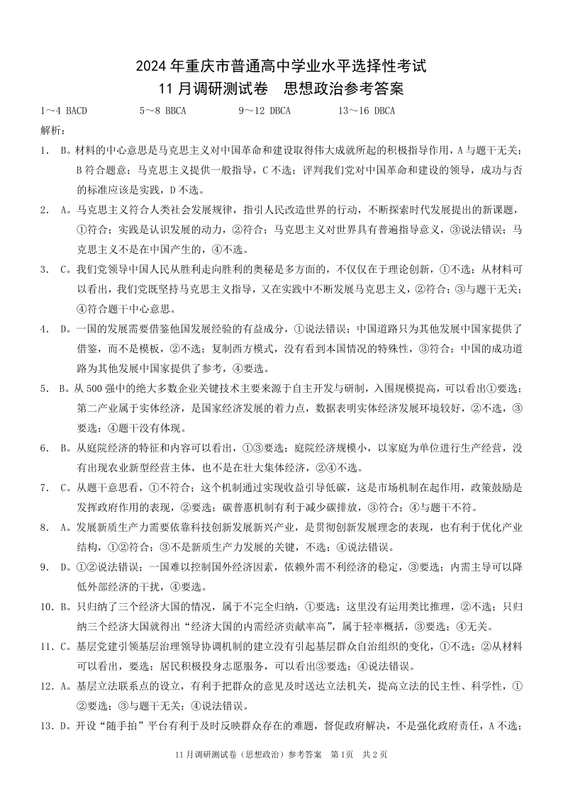 重庆康德半期统考2024年普通高等学校招生全国统一考试高三11月调研卷政治答案