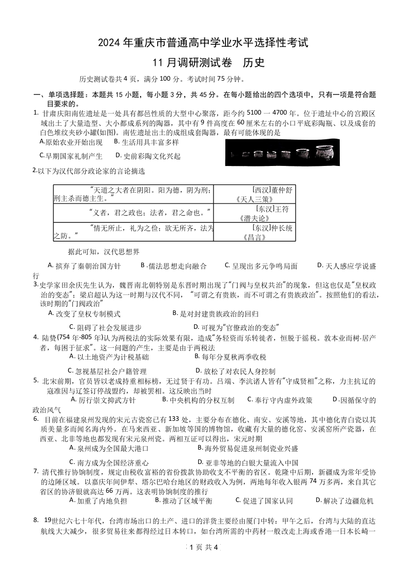 重庆康德半期统考2024年普通高等学校招生全国统一考试高三11月调研卷历史