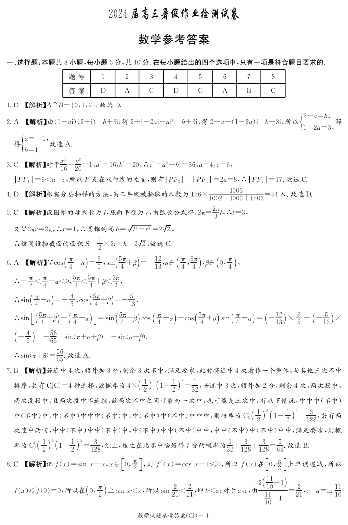 湖南省长沙市长郡中学2024届高三上学期入学考试数学答案