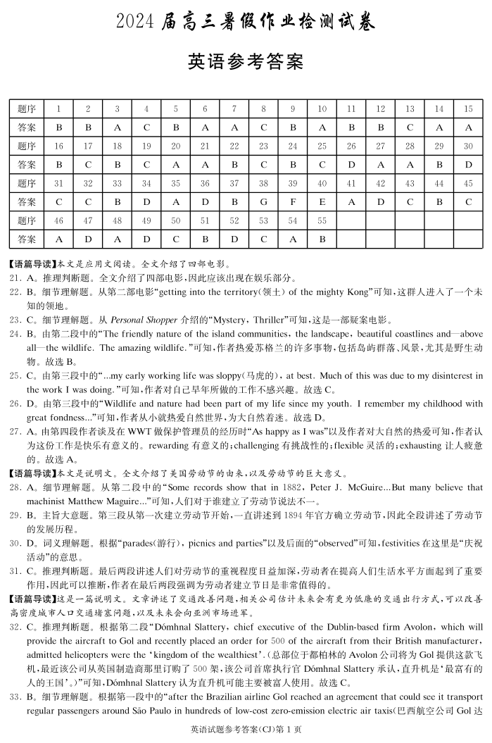 湖南省长沙市长郡中学2024届高三上学期入学考试英语答案